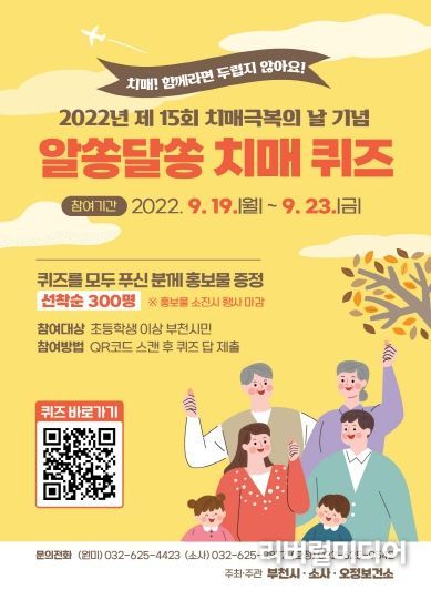 첫 번째 알쏭달쏭 치매퀴즈는 지역사회에 치매친화 환경을 조성하기 위해 기획됐다. QR코드로 설문에 접속 후 치매와 관련된 퀴즈 10문항의 답을 제출하면 된다. 초등학생 이상 부천시민 총 300명의 행사참여자를 모집하며, 행사는 선착순으로 마감된다.