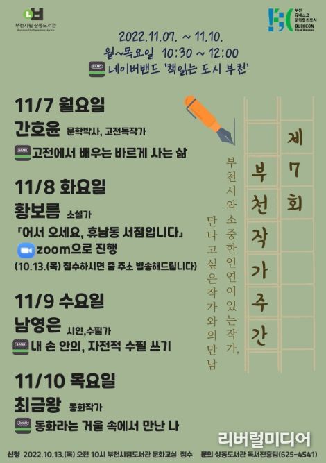 [리버럴미디어=공소리 기자] 부천시는 11월 7일부터 10일까지 ‘부천작가주간’으로 정하고 부천에서 활동하는 분야별 대표 작가와 시민이 만나고 싶어하는 작가를 초청하여 릴레이 강연회을 개최한다.