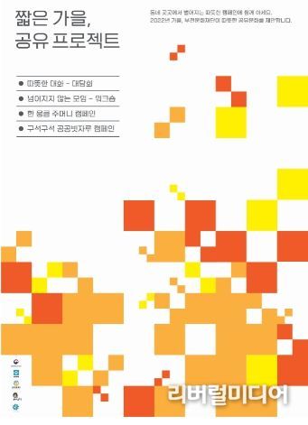 올가을 진행될 ‘짧은 가을, 공유 프로젝트’는 지역공동체를 위해 겨울철 겪을 수 있는 어려움의 해결 방안을 찾아가는 연대와 공감의 시간으로 마련된다. ▲설치미술 작가 이효열과 함께하는 대담회 ‘따뜻한 대화’ ▲공유문화를 통한 문화도시 부천의 발전을 고민하는 ‘넘어지지 않는 모임’ ▲불가사리로 만든 친환경 제설제를 이용해 이동 편의를 돕는 ‘한 움큼 주머니 캠페인’ ▲빗자루를 마을 거점 공간에 두고 누구나 낙엽과 눈을 쓰는 ‘구석구석 공공 빗자루 캠페인’ 등이 진행된다.