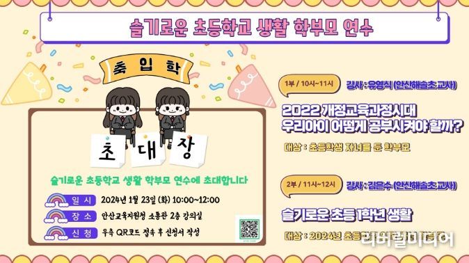 [리버럴미디어=공소리 기자] 경기도안산교육지원청은 1월 23일 안산 관내 초등학교 학부모를 대상으로 새로운 교육과정 적용에 따른 학부모 역량 강화를 위한'슬기로운 초등학교 생활'연수를 실시할 예정이다.