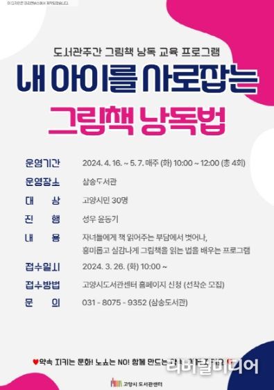 [리버럴미디어=공소리 기자] 고양특례시 삼송도서관은 제60회 도서관주간을 맞이해 성우와 함께하는 그림책 낭독 프로그램 ‘내 아이를 사로잡는 그림책 낭독법’을 4월 16일부터 운영한다고 밝혔다.
