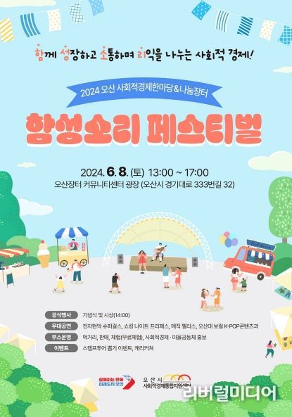 [리버럴미디어=공소리 기자] 오산시는 오는 8일 토요일 오산장터 커뮤니티센터 광장에서 2024사회적경제한마당(부제:함성소리 페스티벌)을 개최한다고 밝혔다.