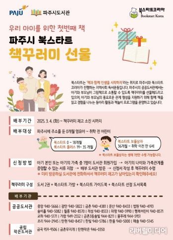 북스타트 책꾸러미 배부 대상자는 파주시에 주소를 둔 0~18개월(북스타트), 19~35개월(북스타트 플러스), 36개월~만 6세 미취학아동(보물상자)에 해당하는 영유아다. 아기나 가족 중 1명이 파주시 도서관 등록 회원이어야 하며 가족관계증명서 또는 주민등록등본을 지참해 도서관에 방문하면 책꾸러미를 받을 수 있다.