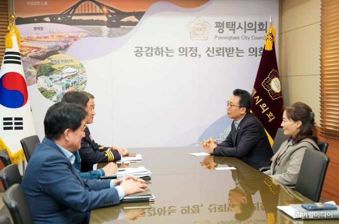 [리버럴미디어=공소리 기자] 평택시의회 강정구 의장은 8일, 시의회 의장실에서 맹훈재 평택경찰서장을 접견해 양 기관의 상호 협력 방안 등을 논의했다.