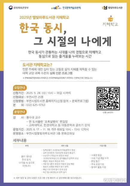 [리버럴미디어=공미소 기자] 부천시는 별빛마루도서관이 문화체육관광부 주최 ‘2025년 도서관 지혜학교’ 공모사업에 선정돼, 6월부터 11월까지 인문학 프로그램 ‘한국 동시, 그 시절의 나에게’를 운영한다고 밝혔다.
