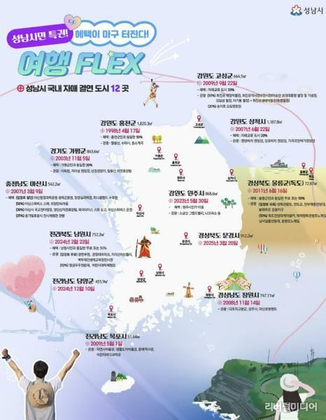 [리버럴미디어=공소리 기자] 성남시민이라면 여름휴가 계획에 앞서 자매도시 관광지 할인 혜택부터 챙겨보자. 신분증 하나로 전국 곳곳의 입장료와 체험비를 최대 50%까지 아낄 수 있다.