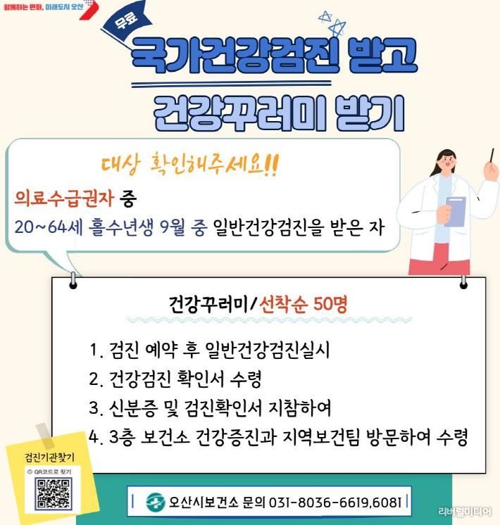 [리버럴미디어=공소리 기자] 오산시는 오산시보건소에서 의료급여수급권자의 건강권 보장을 위해 만 20세에서 64세 사이 홀수년도 출생자를 대상으로 하는 국가건강검진 참여를 적극 독려한다고 밝혔다. 또한 9월 중 검진을 완료한 선착순 50명에게는 ‘건강꾸러미’를 제공할 예정이다.