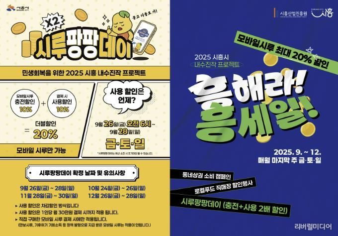 시흥시는 지난 달 말부터 지역화폐 모바일 시루를 최대 20% 할인하는 이벤트 ‘시루팡팡데이’를 추진 중이다. 사실상 시흥시의 2025년 하반기 상권 활성화 사업의 핵심인 이번 이벤트는 시흥시 지역화폐 모바일 시루를 충전 시 7~10%, 시루 가맹점에서 결제 시 추가로 7~10%할인 하는 것을 골자로 한다.