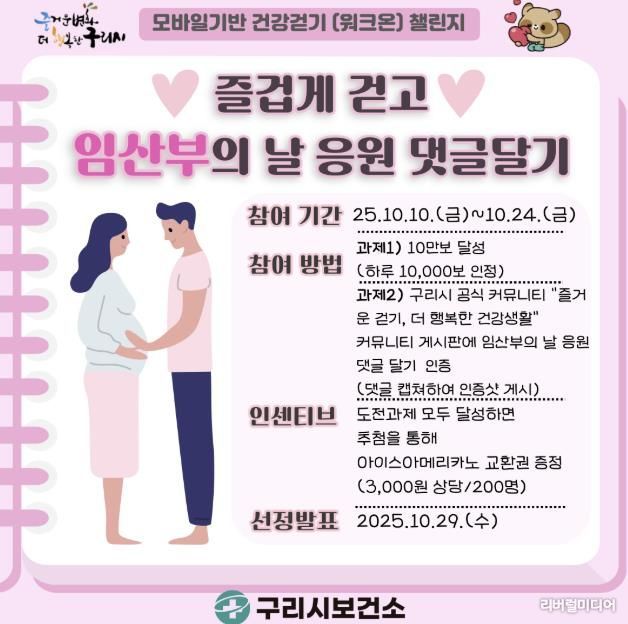 [리버럴미디어=공소리 기자] 구리시는 제20회‘임산부의 날’(10월 10일)을 기념해 임신과 출산의 가치를 되새기고 시민 건강 증진을 도모하기 위한 ‘즐겁게 걷고, 임산부의 날 응원 댓글 달기’ 챌린지를 오는 10월 10일부터 24일까지 15일간 운영한다고 밝혔다.