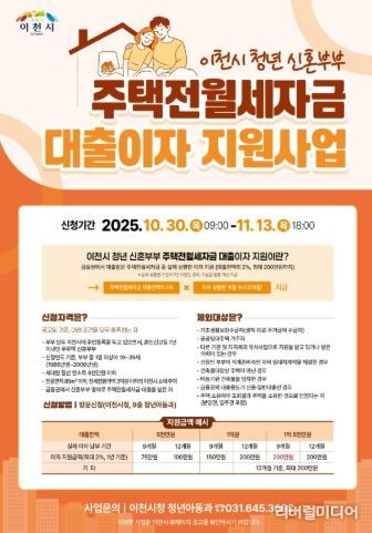 지원대상은 ▲부부 모두가 이천시에 주민등록을 두고 ▲연령[부부 중 1명 이상이 19세~39세(1986년생~2006년생)] ▲소득(세대원 합산 연 소득 8천만 원 이하) ▲주택(전용면적 85㎡ 이하, 전세전환가액 3억 원 이하의 이천시 소재 주택) ▲대출조건(금융권에서 신혼부부 명의 주택전월세자금 대출) 등을 모두 만족하는 무주택 신혼부부이다.