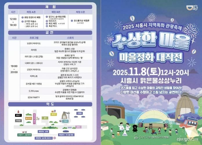 [리버럴미디어=공소리 기자] 시흥시는 2025년 시흥시 지역특화 관광축제 지원사업 선정 축제인 ‘수상한 마을 마을정화대작전’을 오는 11월 8일 정왕동 맑은물상상누리 일원에서 개최한다. 이번 축제는 시흥시 청년예술연합회가 주관한다.