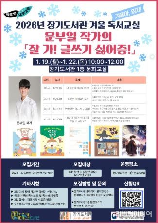 [리버럴미디어=공소리 기자] 김포시 장기도서관은 겨울방학을 맞아 2026년 겨울 독서교실 ‘문부일 작가의 잘 가! 글쓰기 싫어증’을 운영한다고 밝혔다. 2026년 1월 19일부터 1월 22일 오전 10시부터 12시까지 총 4차시로 장기도서관 1층 문화교실에서 진행한다..