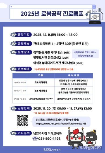 [리버럴미디어=공소리 기자] 남양주시는 20일부터 27일까지 관내 초등학교 1학년부터 3학년을 대상으로 ‘2025년 로봇공학 진로캠프’참가자를 모집한다.