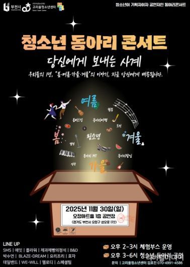 [리버럴미디어=공소리 기자] 부천여성청소년재단이 운영하는 고리울청소년센터는 2025년 11월 30일, 부천시 고강동 소재 오정아트홀 1층 공연장에서 지역 청소년들이 직접 기획하고 무대에 오르는 특별한 공연, ‘청소년 동아리 콘서트 – 당신에게 보내는 사계’가 열린다.