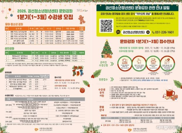 [리버럴미디어=공소리 기자] 수원시청소년청년재단 권선청소년청년센터는 오는 1월 6일부터 3월 27일까지 지역사회 평생학습 문화강좌 1분기(1~3월) 수강생을 모집한다.