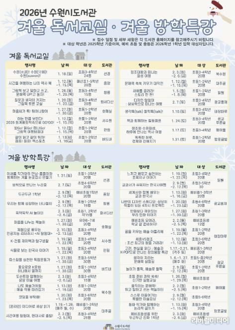 수원시도서관 관계자는 “겨울방학 동안 아이들이 책과 가까워지고 다양한 경험을 쌓을 수 있도록 프로그램을 준비했다”며 “도서관이 배움과 휴식이 공존하는 공간이 되길 바란다”고 말했다.