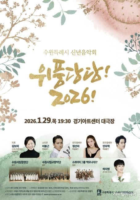 수원시 관계자는 “신년음악회 ‘위풍당당! 2026!’는 장르와 세대를 아우르는 구성으로 수원특례시의 문화적 역량과 예술적 비전을 보여주는 무대”라며 “음악으로 희망과 용기를 전하는 이번 음악회에 많은 시민이 함께해 주시길 바란다”고 말했다.