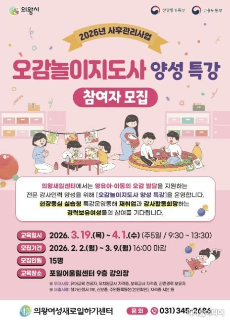 [리버럴미디어=공소리 기자] 의왕시 여성새로일하기센터가 '오감놀이지도사 양성 특강'의 교육생을 모집한다.