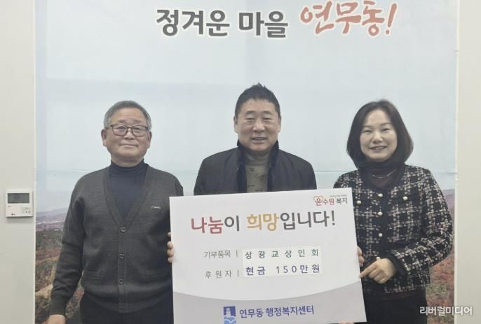 [리버럴미디어=공소리 기자] 수원시 장안구 연무동은 지난 19일, 상광교상인회 소속인 광교헌농원, 백운주말농장, 폭포농원, 형제농원, 자선농원 5개소가 행정복지센터를 방문해 어려운 이웃을 위한 성금 150만원을 기탁했다고 밝혔다.