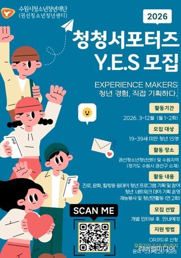 [리버럴미디어=공소리 기자] 수원시청소년청년재단 권선청소년청년센터는 청년이 문화 프로그램의 기획과 운영 과정에 주도적으로 참여하며 또래 간 네트워크를 형성하고, 이를 통해 지역사회에 긍정적인 에너지를 확산할 수 있도록 돕는 '2026 청청서포터즈 YES(Youth Energy Supporters)' 참가자를 모집한다.
