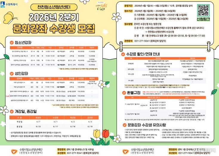 2분기 문화강좌 수강 신청은 선착순으로 진행된다. 기존 수강회원은 3월 3일부터 24일까지, 신규 회원은 3월 10일부터 24일까지 접수 가능하다. 신청 방법은 수원시청소년청년재단 수강신청 홈페이지를 통한 온라인 접수 또는 천천청소년청년센터 1층 안내데스크 방문을 통해 가능하다.