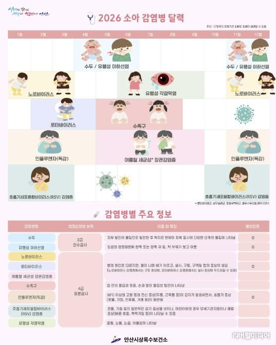특히 이번에 배포되는 ‘소아 감염병 달력’은 시기별 주요 감염병 정보를 한눈에 확인할 수 있도록 구성됐다. 피부 발진, 고열, 구토 등 주요 증상과 법정 감염병 분류 정보가 상세히 수록돼 있어 현장에서의 조기 발견과 대처에 큰 도움이 될 것으로 기대된다.