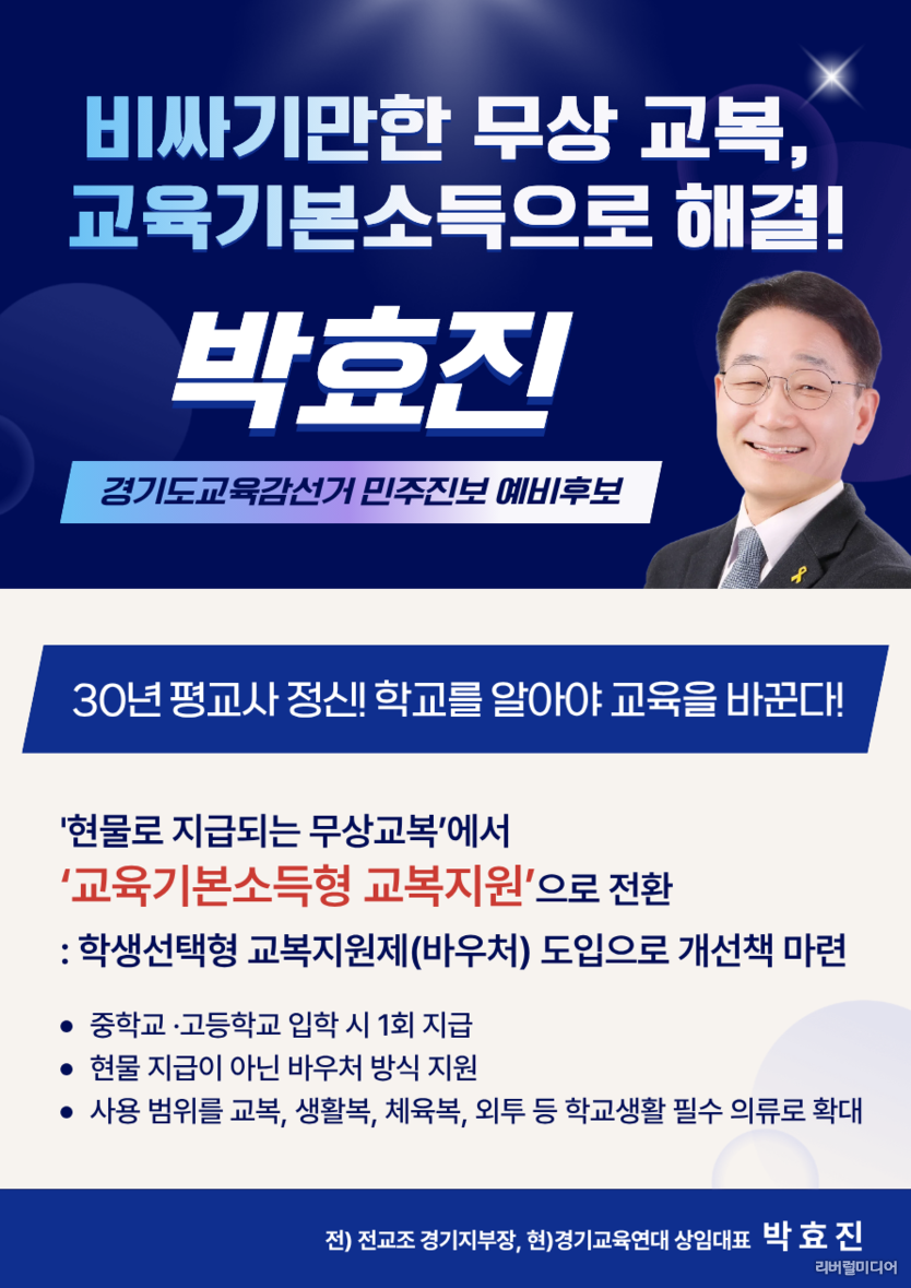 [리버럴미디어=공소리 기자] 박효진 경기도교육감 예비후보는 23일 현행 무상교복 정책의 한계를 지적하며 이를 ‘교육기본소득형 교복지원’으로 전환할 것을 공식 제안했다.