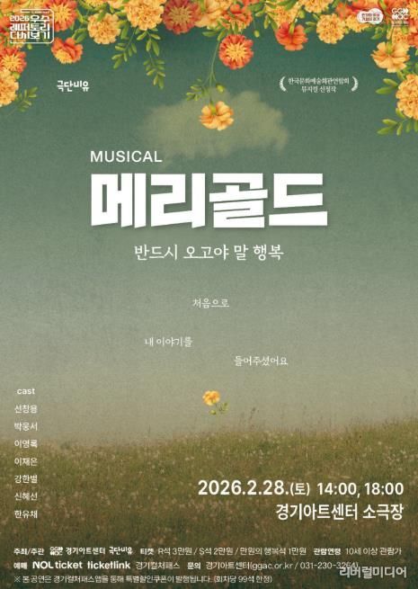 [리버럴미디어=공소리 기자] 경기도와 경기아트센터는 오는 28일 오후 2시와 6시 경기아트센터 소극장에서 뮤지컬 ‘메리골드’ 공연을 선보인다.