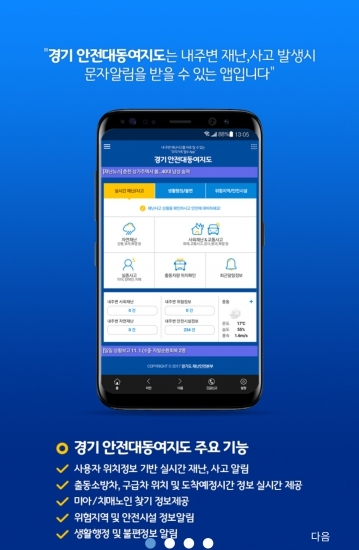 남경필 도지사는 “재난발생 소식을 신속하게 접하게 되면 그만큼 대처할 수 있는 시간이 늘어 안전성을 높일 수 있다”면서 “안전대동여지도는 화재나 지진 등 대형 재난은 물론 교통사고 등 생활 속 위험으로부터 도민을 보호할 수 있는 경기도민 필수 앱이다”라고 말했다.