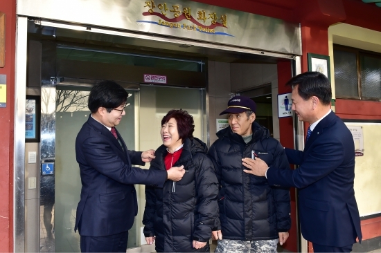 [리버럴미디어=강한별 기자] 염태영 수원시장이 고경홍 IBK기업은행 동수원지점장과 함께 지난 14일 장안공원을 찾아 공중화장실 관리인들에게 방한복 269벌을 전달했다.