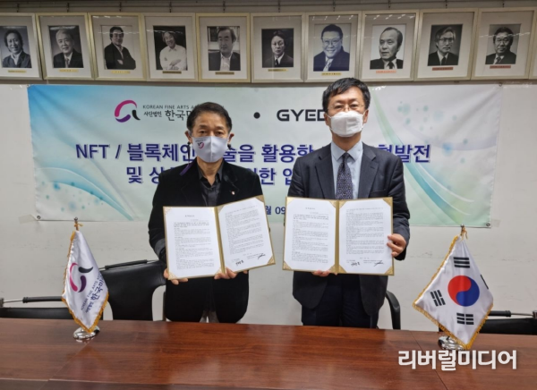 [리버럴미디어=공소리 기자] 홍콩에 본부를 둔 글로벌 블록체인 플랫폼 전문업체 가이덤재단(대표 티나 캐넌)과 (사)한국미술협회는 10일 대체불가능토큰(NFT) 미술거래 솔루션의 공동개발과 보급을 위한 공식 협약을 체결했다.