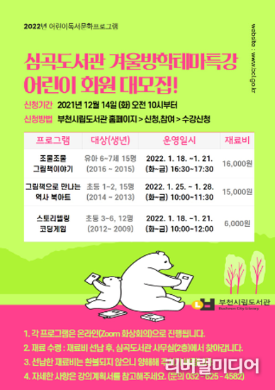 [리버럴미디어=공미소 기자] 부천시 심곡도서관에서 2022년 겨울방학을 맞아 어린이의 독서 습관을 함양하고 창의력 계발에 도움을 주는 독서문화프로그램을 1월중 운영한다.