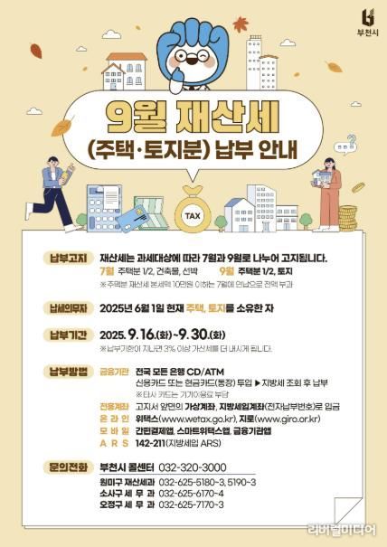[리버럴미디어=공미소 기자] 부천시는 9월 재산세 납부의 달을 맞아 고지서를 발송하고, 기한 내 납부를 안내하고 있다.
