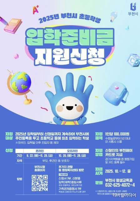 신청 기간은 오는 22일부터 11월 28일까지이며, 온라인과 동 행정복지센터 방문 신청 모두 가능하다. 온라인 신청은 부천시 홈페이지에서 가능하며, 관내 초등학교에 다니는 학생과 같은 세대에 주민등록이 되어 있는 부모만 신청할 수 있다.