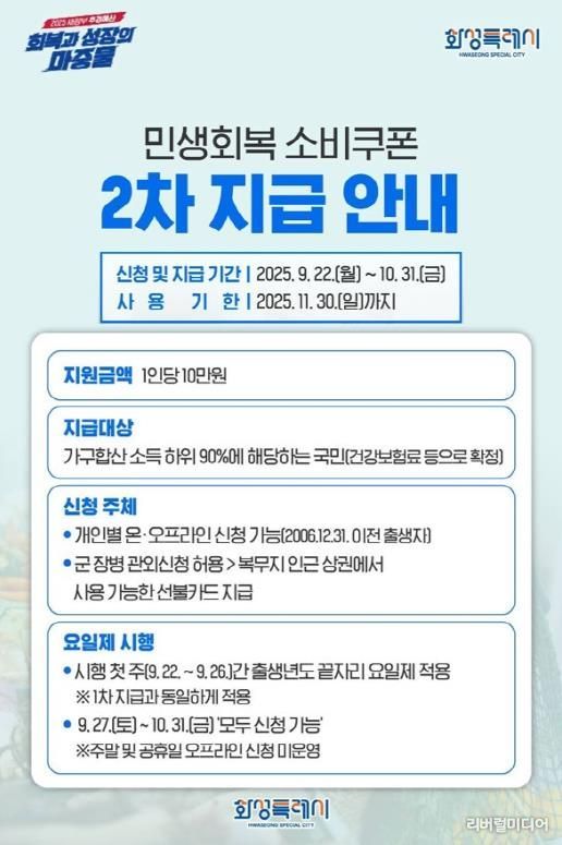 정명근 화성특례시장은 “1차 사업에서 보여준 높은 참여율과 소비 촉진 효과를 바탕으로, 이번 2차 사업은 취약계층과 군 장병까지 포괄하는 촘촘한 지원 체계를 갖췄다”며 “민생 안정과 소상공인 활력이라는 두 가지 목표를 동시에 달성하겠다”고 말했다.