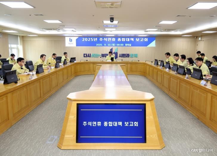 [리버럴미디어=공미소 기자] 부천시는 지난 22일 시청 창의실에서 조용익 시장을 주재로 부시장을 비롯한 국장과 부서장이 참석한 가운데 ‘2025년 추석 연휴 종합대책 보고회’를 열었다. 이번 보고회는 7일간 이어지는 추석 연휴를 앞두고 시민 생활 전반에 걸친 분야별 대책을 점검하기 위해 마련됐다.