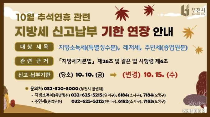[리버럴미디어=공미소 기자] 부천시는 긴 추석 연휴로 인해 시민들이 지방세를 기한 내에 신고·납부하는 데 불편을 겪을 것으로 예상됨에 따라, 10월 납부 대상인 지방세 3종의 신고·납부 기한을 기존 10일에서 15일로 5일 연장한다고 밝혔다.