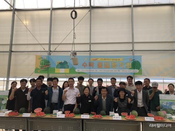 [리버럴미디어=공소리 기자] 양평군농업기술센터는 25일 청운면 스마트팜 교육장에서 2기작으로 재배한 수박 11품종을 대상으로 ‘2025년 수박 신품종 육성 및 기술보급을 위한 품질평가회’를 개최했다.