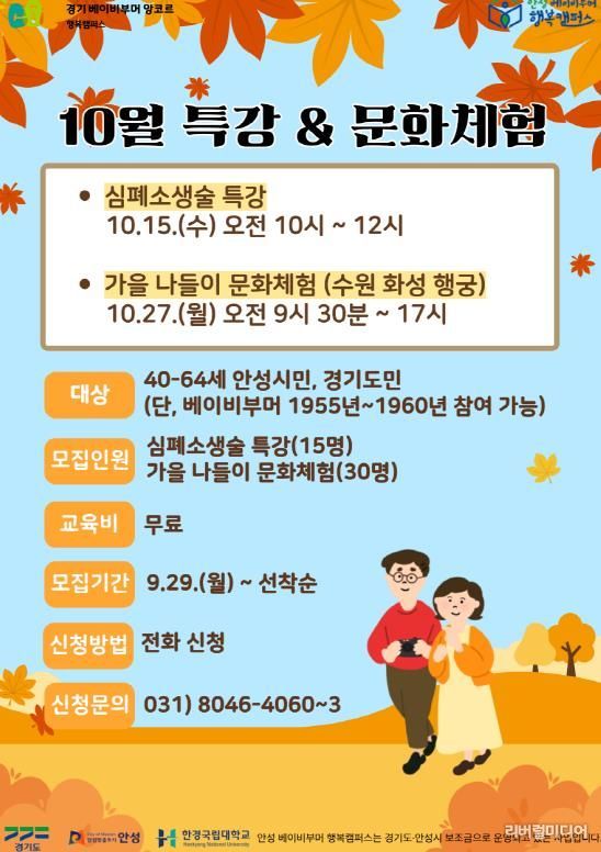 [리버럴미디어=공소리 기자] 안성 베이비부머 행복캠퍼스(한경국립대학교 평생교육원)는 오는 10월 15일부터 27일까지 중장년 안성시민(경기도민)을 대상으로 ‘10월 특강(심폐소생술) 및 문화체험(수원화성행궁)’ 프로그램을 운영한다고 밝혔다.