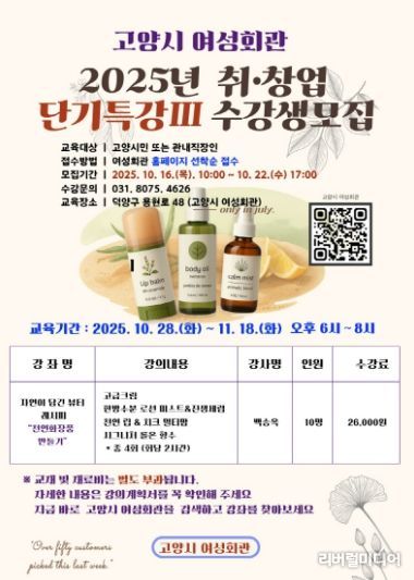[리버럴미디어=공소리 기자] 고양특례시 여성회관에서는 친환경과 건강을 중시하는 최신 트렌드를 반영한‘취창업 단기특강Ⅲ’수강생을 모집한다.