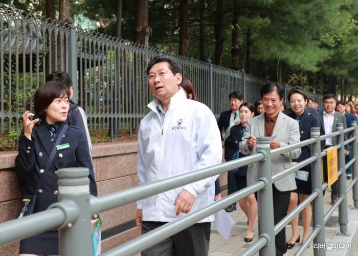 [리버럴미디어=공소리 기자] 이상일 용인특례시장은 2일 오전 수지구 죽전로 대청초등학교 사거리 횡단보도에서 등교시간에 맞춰 진행된 어린이 교통지도 봉사에 참여하고 학교 주변통학로를 둘러보며 일부 시설 개선을 지시했다.