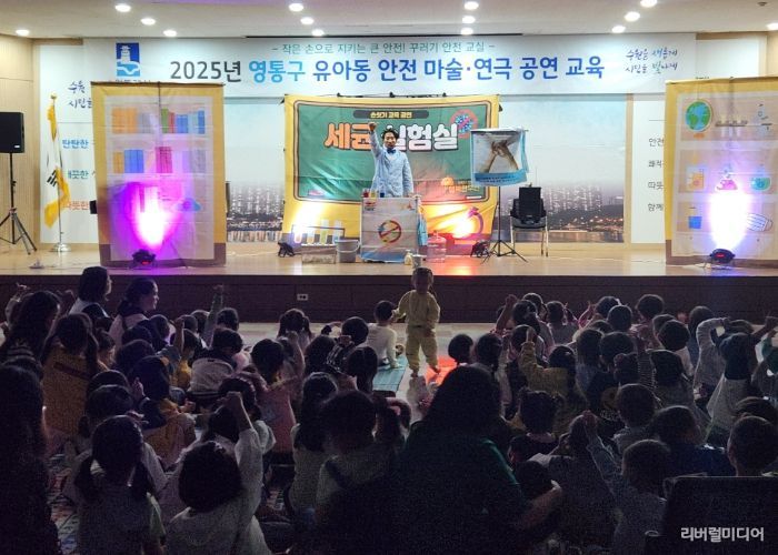 [리버럴미디어=공소리 기자] 수원시 영통구는 2025. 10. 13. 영통구청 대회의실에서 관내 유아를 대상으로 안전한 위생 습관을 형성하기 위한 ‘찰리박사의 세균실험실’ 체험형 안전마술·연극 공연 교육을 실시했다.