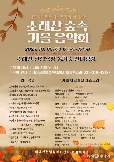[리버럴미디어=공소리 기자] 시흥시 대야ㆍ신천행정복지센터는 오는 10월 18일 소래산 삼림욕장 놀자숲 잔디광장에서 대야ㆍ신천동 지역 주민을 위한 ‘소래산 숲속 가을 음악회’를 개최한다.