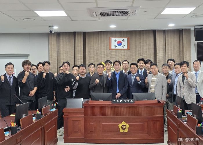 [리버럴미디어=공소리 기자] 경기도의회 문화체육관광위원회 황대호 위원장(더불어민주당, 수원3)이 15일 한국대학축구연맹 박한동 회장을 비롯한 연맹 관계자들 및 도내 소재 대학 축구팀 감독들과 경기도 축구 활성화를 위한 정담회를 가졌다.
