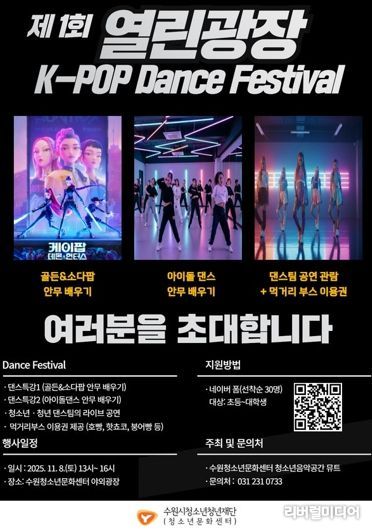 [리버럴미디어=공소리 기자] 수원시청소년청년재단 청소년문화센터는 2025년 11월 8일 야외광장에서 청소년·청년이 함께 즐기는 가을 문화행사 열린광장 '청소년·청년 댄스 페스티벌'을 개최한다.