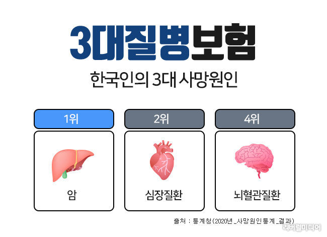 [리버럴미디어=공소리 기자] 흔히 3대질병이라 일컫는 암, 심혈관질환, 뇌혈관질환은 통계청 발표자료에 따르면 한국인의 주요 사망원인 중에서 3위 폐렴을 제외하고 1~4위를 차지하고 있으며, 이전부터 지금까지도 살면서 가장 먼저 대비해야 하는 치명적인 질병으로 강조되고 있다. 이러한 중대질병에 대비하기 위하여 상기 세가지 치명적인 질병을 집중보장하는 3대질병진단비보험을 많이 가입하고 있다. 3대진단비보험은 각각의 질병을 중점적으로 보장하면서도 가입자 특성에 맞는 특약을 추가함으로써 종합건강보험으로도 활용할 수가 있다.