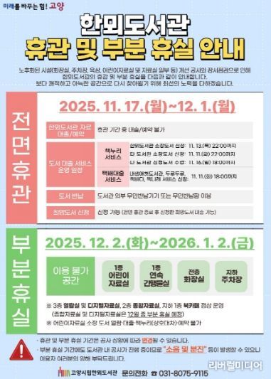 [리버럴미디어=공소리 기자] 고양특례시 한뫼도서관은 공간 및 환경개선 공사 등을 위해 오는 11월 17일부터 12월 1일까지 15일간 임시 휴관한다고 밝혔다.