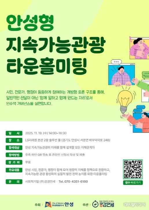 [리버럴미디어=공소리 기자] 안성시는 오는 11월 19일 오후 2시 LS미래원에서 시민・전문가・행정이 함께 안성 관광의 현재와 미래를 논의하는 '안성형 지속가능관광 타운홀미팅'을 개최한다.