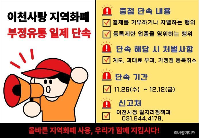 [리버럴미디어=공소리 기자] 이천시는 경기이천사랑지역상품권의 올바른 사용 환경을 조성하고 건전한 유통 질서를 확립하기 위해 11월 26일부터 12월 12일까지 지역사랑상품권 부정유통 근절을 위한 일제 단속을 추진한다고 밝혔다.