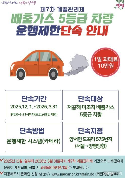 [리버럴미디어=공소리 기자] 양평군(은 오는 12월 1일부터 2026년 3월 31일까지 제7차 미세먼지 계절 관리제 시행에 따라 배출가스 5등급 차량에 대한 운행 제한 단속을 시행한다고 밝혔다.